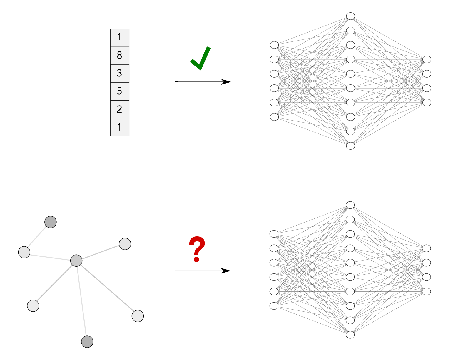 These two properties are directly correlated to the first Geometric Prior defined above. As we discussed before, we solved a similar problem in Convolutional Neural Networks (it doesn't matter if pixels are translated) by using Convolutions on pixels neighbours (more formally: using local equivariant processing layers).