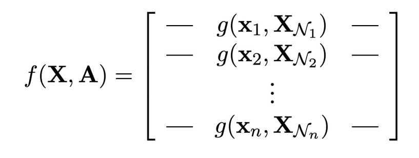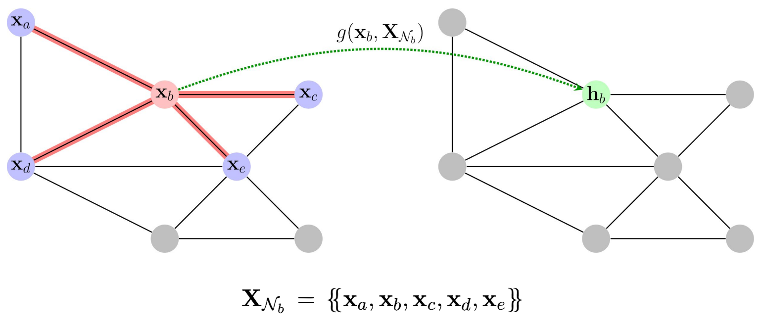 Let’s define the set \( N_i \) of the neighbours of node \( i \) as \( X_Ni={x_j: j N_i} \). In this setting we can simply identify a function \( g \) able to process locally all the nodes: