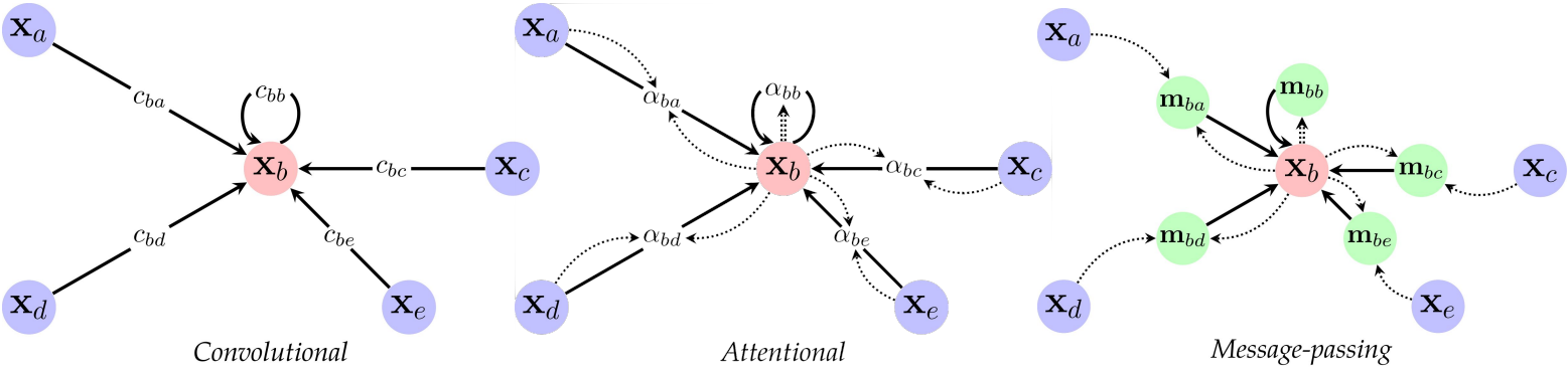 - Attentional GNNs: they use a self attention mechanism similar to Transformer models to learn weights between each couple of connected nodes.
