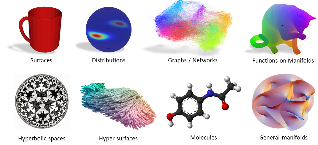 - non-Euclidean data: in even broader terms, data that doesn’t obey Euclidean postulates (e.g. in these domains the distance between two points is not a straight line). Examples are Molecular Structures, Social Network Interactions, or Meshed 3D surfaces.