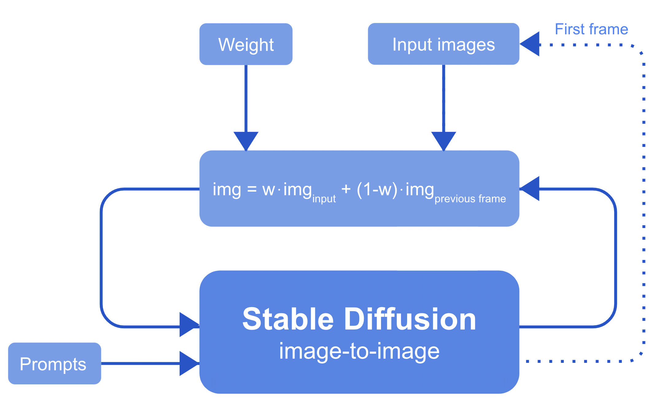 Let's get more into the details. The formula image = weight • image_input + (1-weight) • image_previous_frame has three important factors: