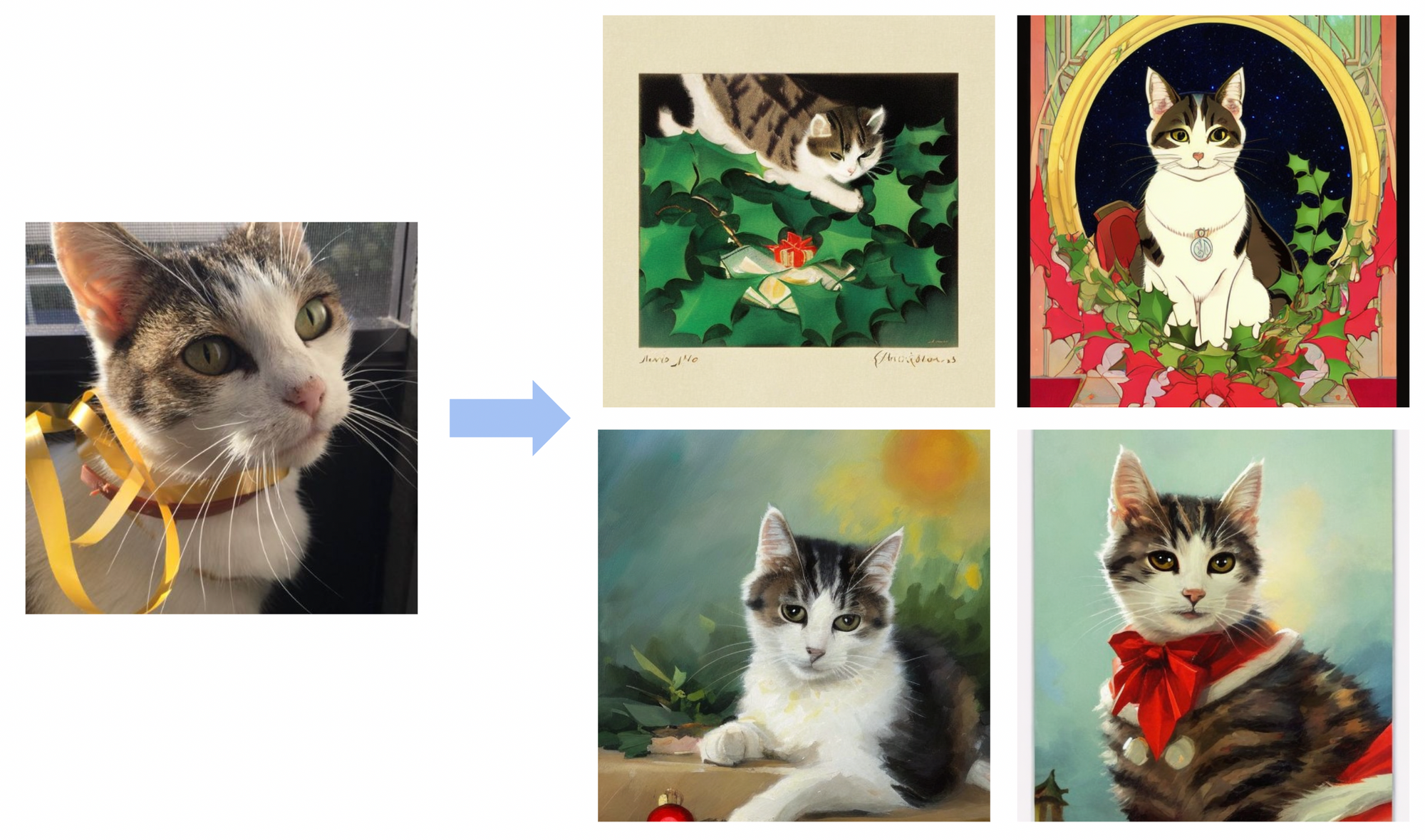 Now, the possibilities are endless. Do you want to create custom Christmas cards in your specific style or with the family pet? No problem! Collect around 20 images of you favourite pet, resize or crop them to 512 by 512 with the help of Birme and you can start training. You can either use an online Colab notebook (with a free GPU) or use the latest optimized version in Automatic1111's web user interface. This last option requires a local GPU however. If you don't want to go trough the hassle of installing everything, you can also opt for the online (paying) option Photo Booth.