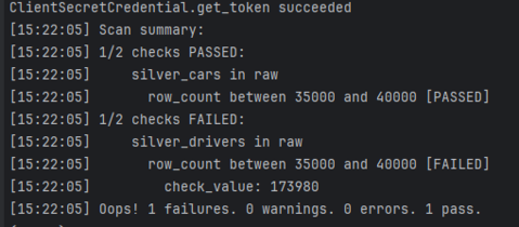 soda scan -d my_cool_database -c configuration.yml checks.ymlwill perform the scan. In the command we need to specify which data source we need to test on, the name of our configuration file where Soda can find the connection details, and the name of your checks file. The result of the scan should show an output like this: