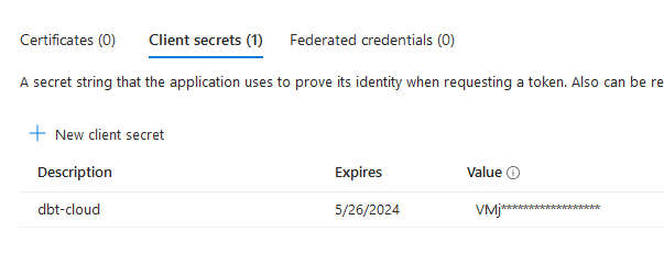 The client secret needs to be created first by going to the certificates and secrets, and clicking "New client secret". Give it an accurate description and an expiry date.