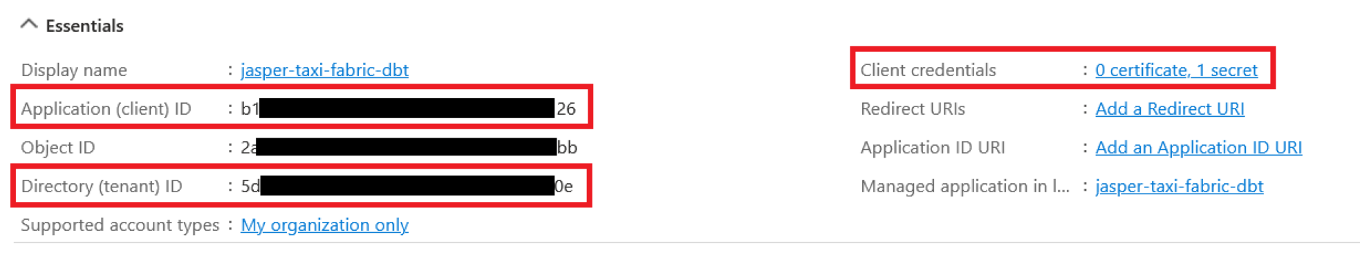 When you have an app registered, you can select it to see more info. To use our service principal to authenticate, we'll need the application ID, tenant ID, and a client secret.