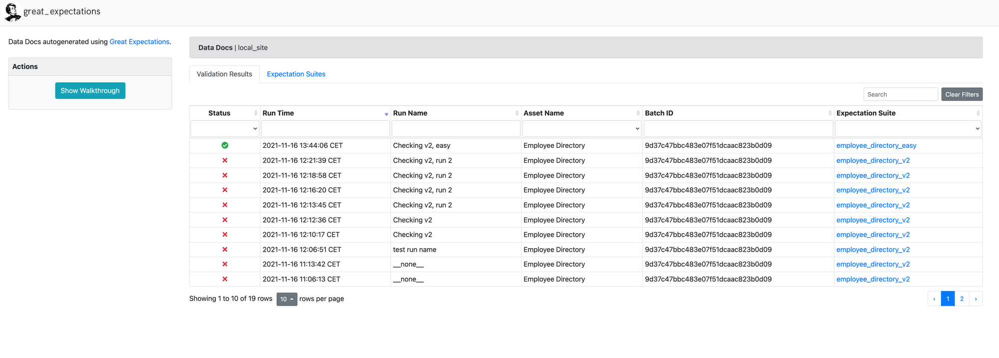 Here you can see a log of all your previous runs with information on a per-expectation level.