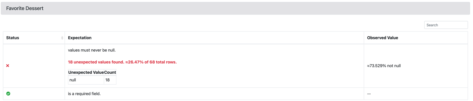 Using our jupyter notebook, it is extremely easy to create your expectation suite while doing some data exploration to make sure you know what to expect. Here you can see our dessert-related expectations π° (along with others).