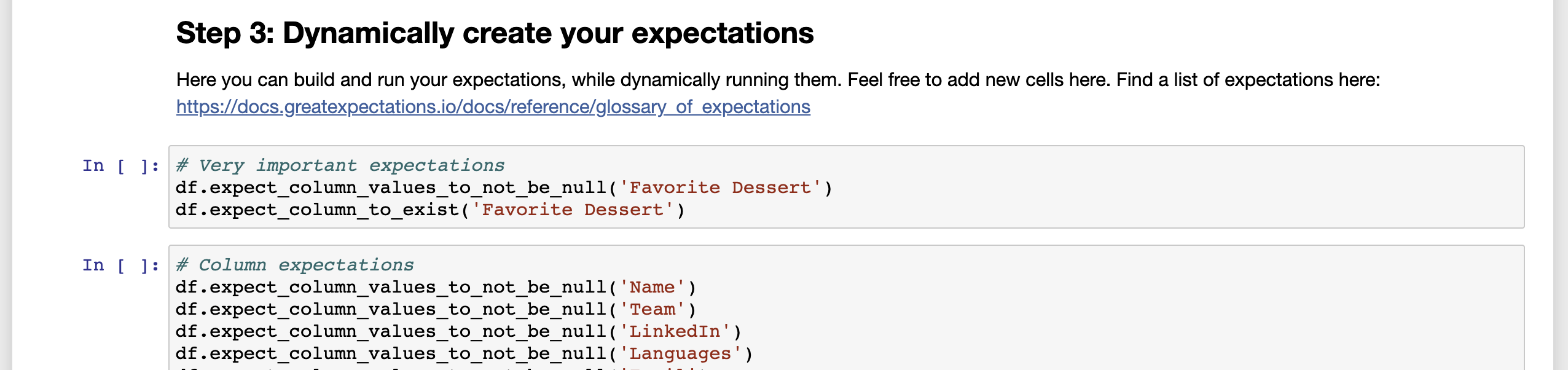 Expectations can be as simple as "I want to be sure that this column is never null" or "I want to make sure the row count is always X". If you want to dig deeper or find a list of possible expectations, you can do so at Great Expectation's official site