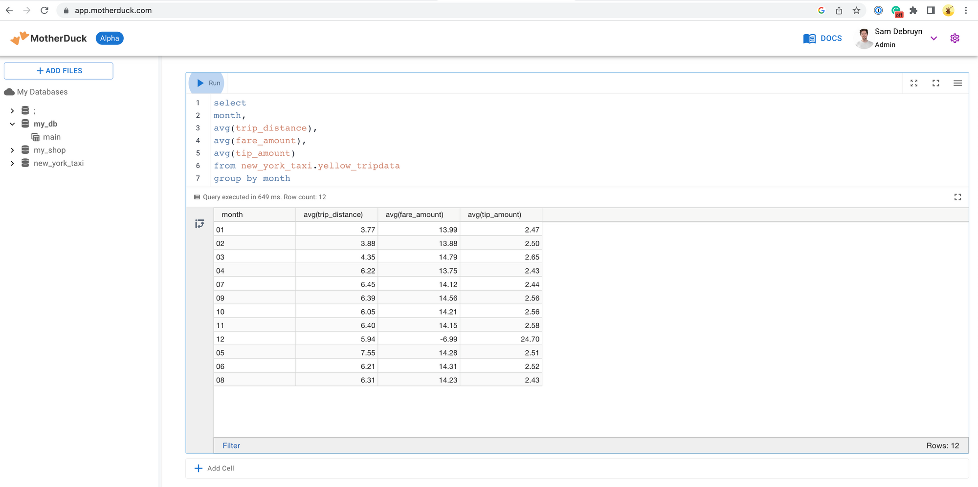 MotherDuck also built a UI for their platform in which you can run queries and instantly get the results. The experience will feel very familiar to users who have worked with Jupyter notebooks before. They are working on expanding this with features like built-in graphs like histograms. Interacting with MotherDuck can be done through any way you use DuckDB today or through their browser experience.