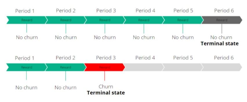 - Terminals = terminal state indicating the end of an episode. In our case, we considered customer churn as well as the end of the period as terminal states. This means that each customer sequence has a terminal state and will be an episode in itself.