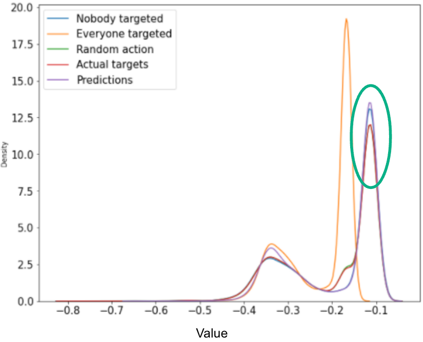 We observe that the model does estimate higher Q-values for the predicted actions and the values are slightly higher than if nobody was targeted. The model also recommends better actions than the actions proposed in the test set (actual targets).
