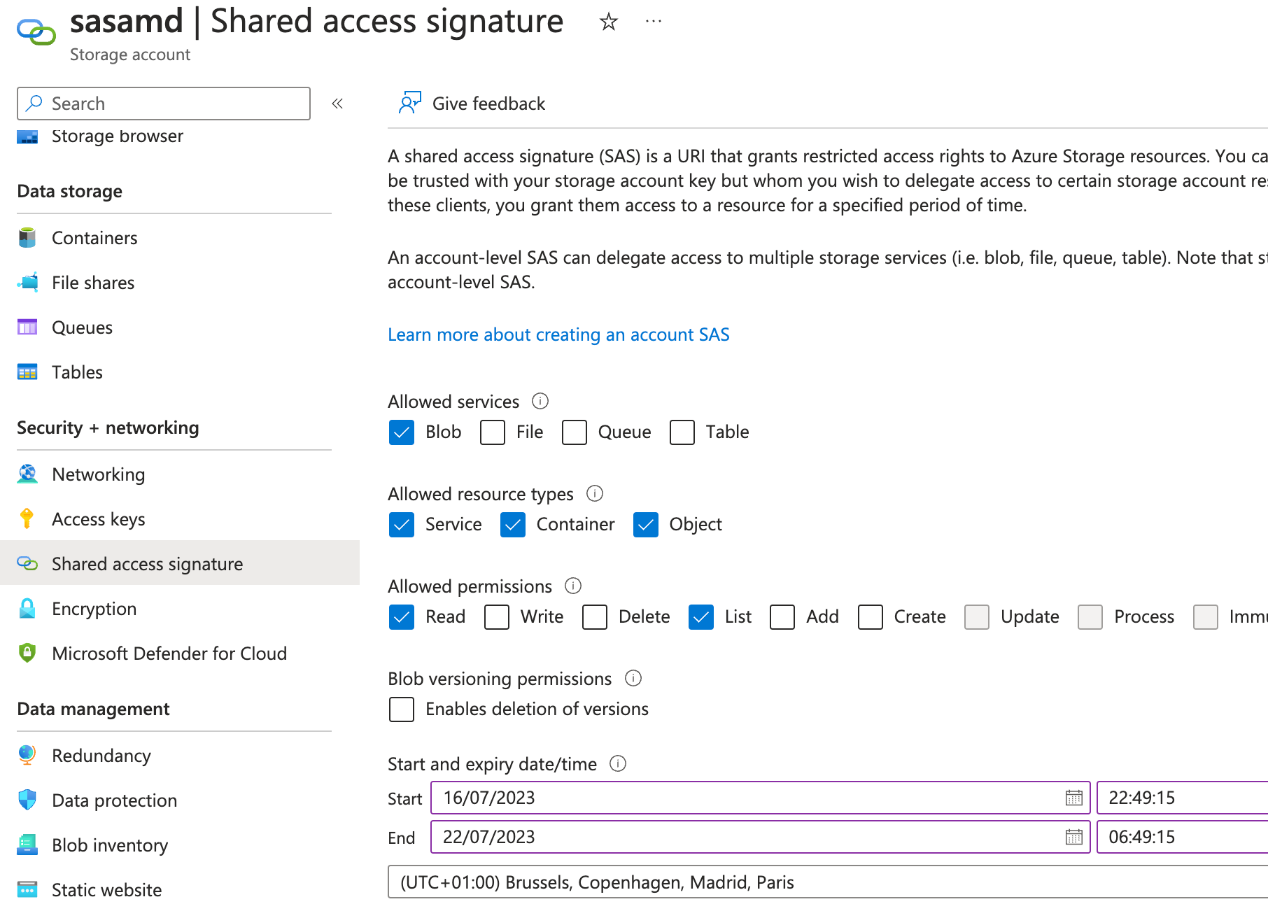 The COPY INTO statement requires a SAS (Shared Access Signature) token. There are various ways you can generate a SAS token, one is by using the Azure Portal. Go to the storage account that you created earlier, and click on Shared access tokens in the left menu. Make sure to include the Read and List permissions.