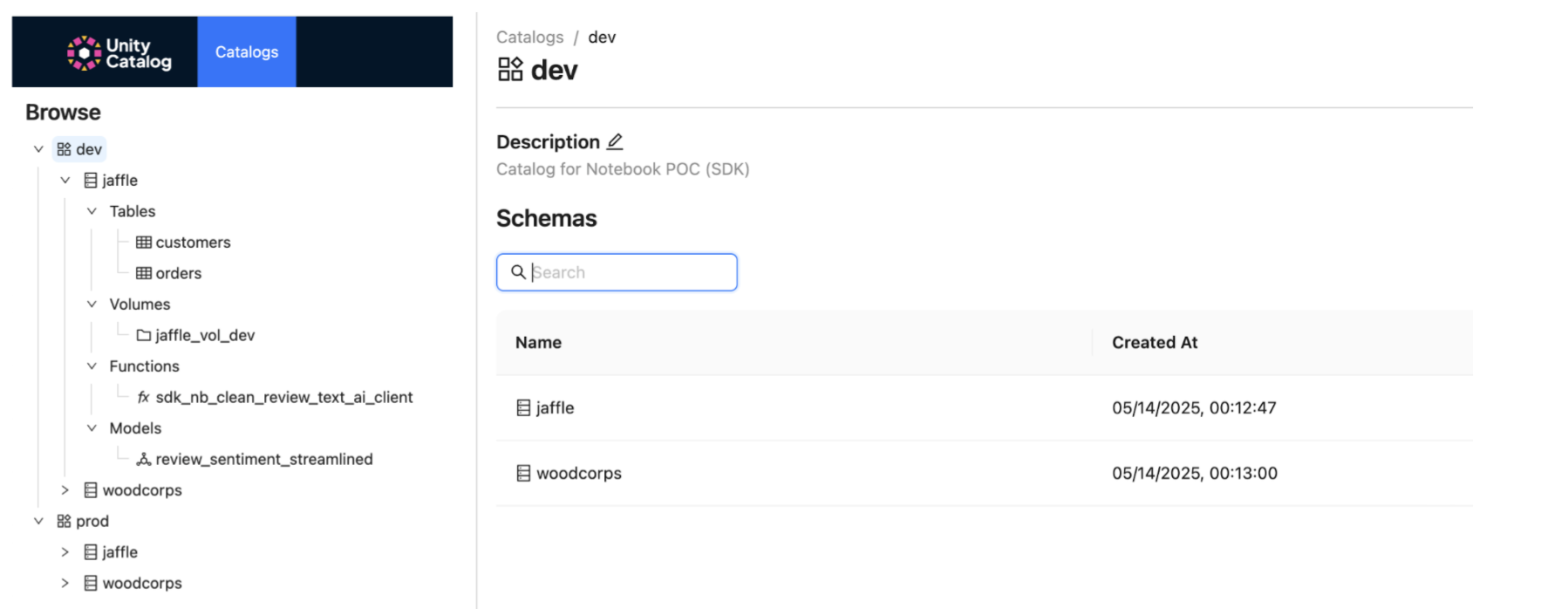 Unity Catalog stores all assets within a 3-level namespace (catalog.schema.asset), a structure you might recognize from Databricks. This design offers complete flexibility, allowing you to organize your setup as it best fits your needs. For example, you could have a single schema for a "dev" or "prod" environment containing all its tables and models, or you might opt for a setup with separate schemas, such as one for tables and another for ml models.