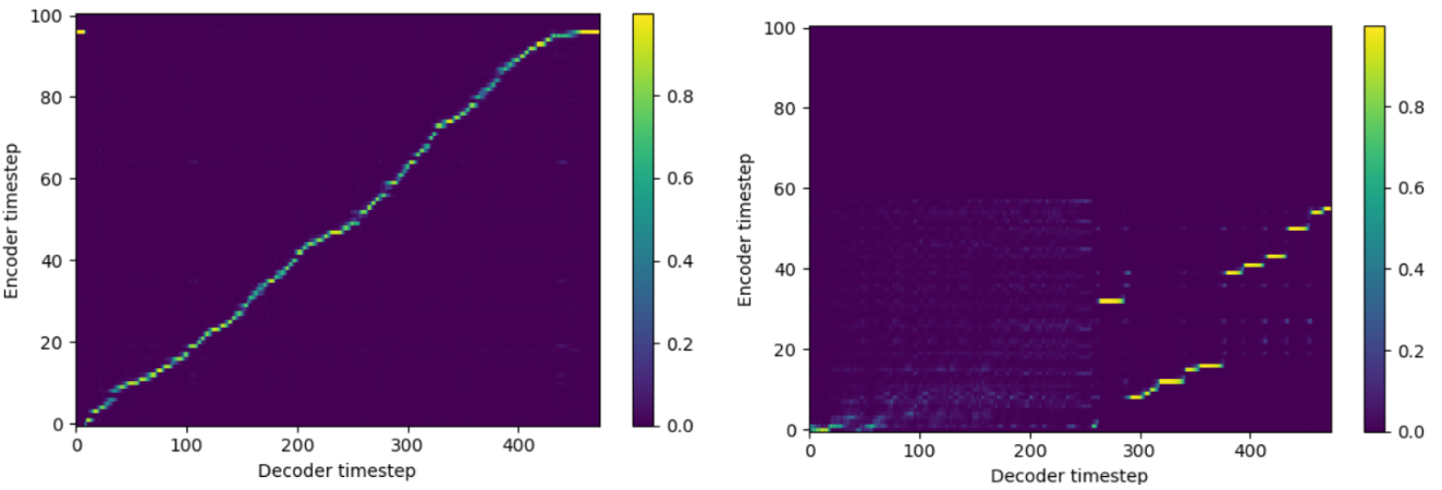The loss function here is defined as the MSE loss between the predicted mel output (from the model) and mel target (from training data). Additionally, a postnet is used to further refine the mel spectrogram predictions and a MSE loss is also computed between the postnet predictions and the target mel spectrogram. The gate loss is related to predicting when the speech should stop. Furthermore, we could take a look at the alignment plots. If the alignment plot shows a diagonal line, it means that the model is accurately predicting the correct output at each time step: the alignment between input text and audio is good. Since we use the mel spectrograms as a big part of the loss and since even with poor alignment they look similar, this does not seem to be the best metric to evaluate the TTS output.
