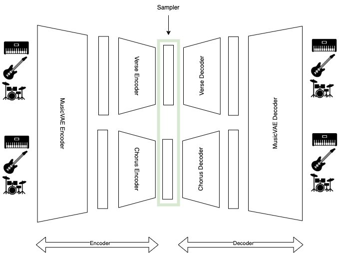 The main idea is to train smaller VAEs that are fed the encodings from MusicVAE as input, and yield their reconstructions as output. Each new VAE is specialised and trained to one specific music type, genre, artist, ... In our use case each VAE is specialised in musical sections and represents a 16-bar trio (melody, bass and drums). This is an idea inspired on MidiMe.