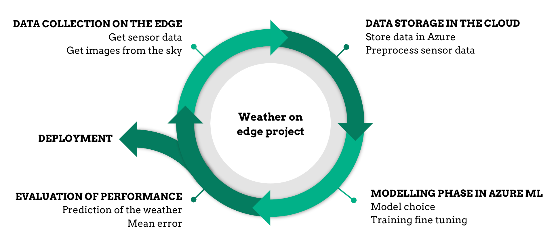 To give an overview, we begin by collecting data using an edge device, which will also be used to make weather predictions. Of course, given the size of the data, it is then sent to the cloud service provider to train the machine learning model, and we chose Microsoft Azure for this project. In the following sections, we will go over each stage of the project in greater detail.