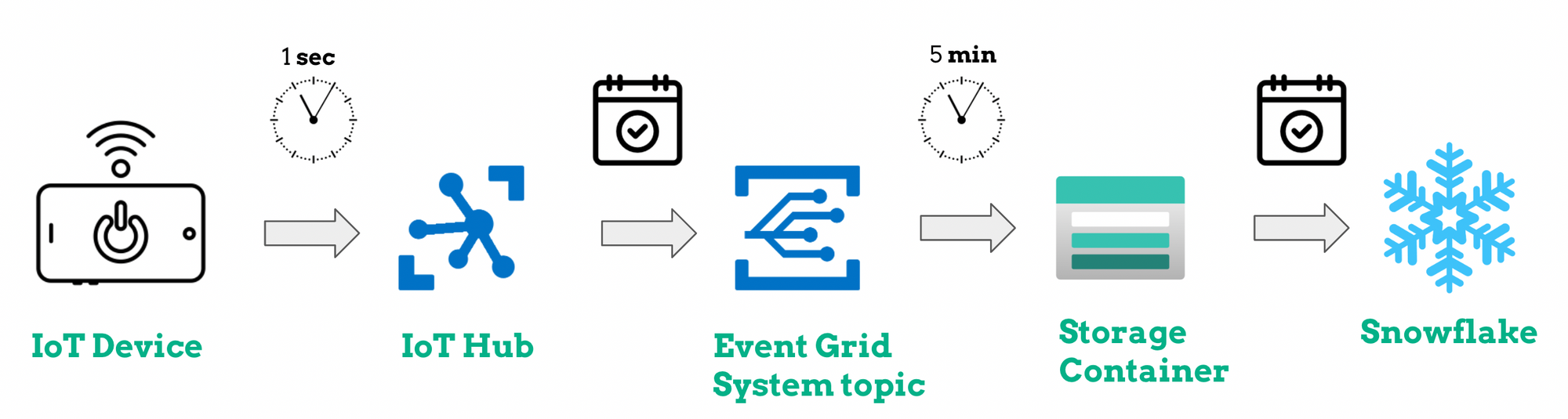 The writing of the data into a storage container is scheduled every 5 minutes using the Event Grid System Topic as a resource. We chose this time frame to avoid writing data every second.