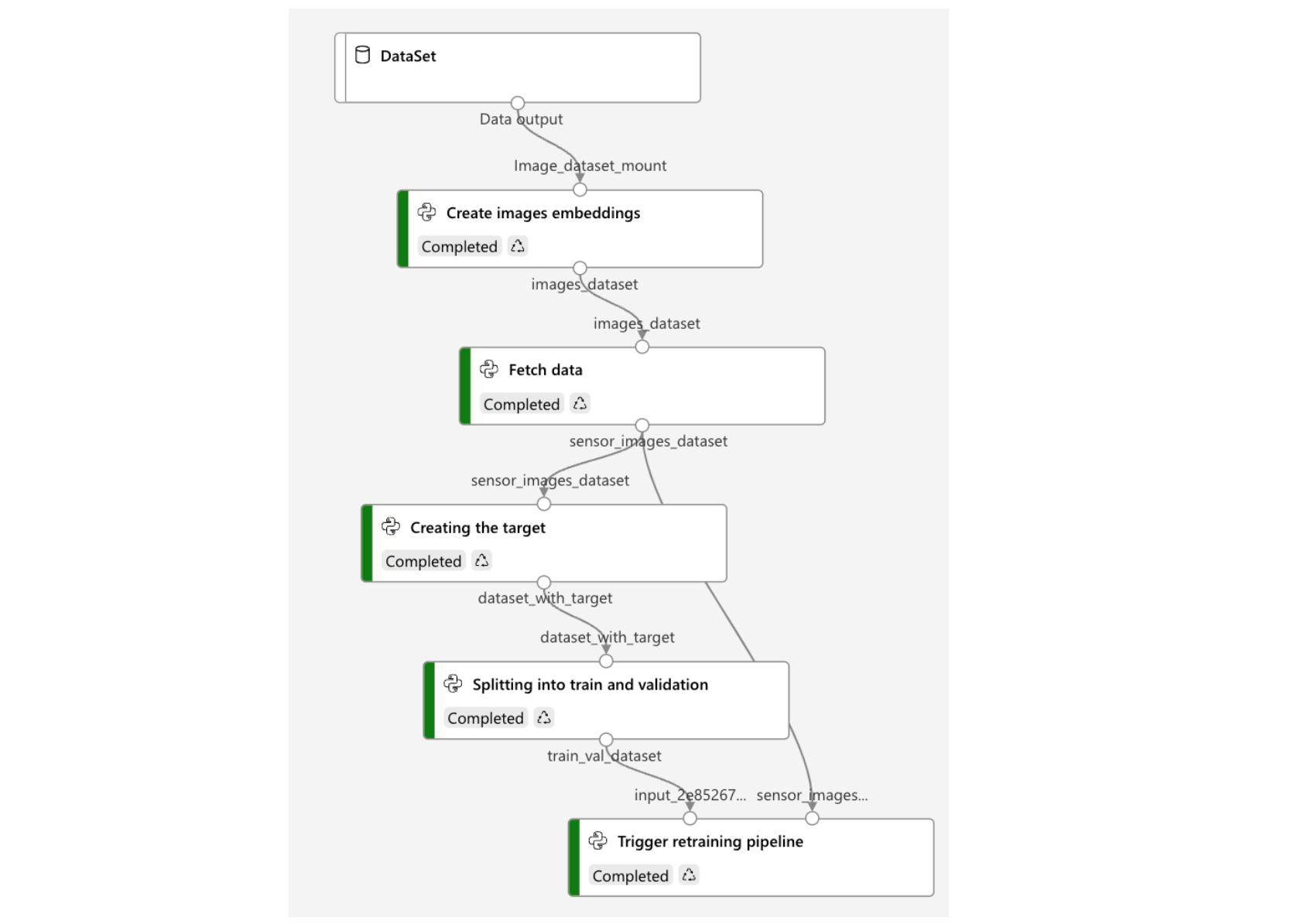 As a result, because the sensor data and sky images are stored in the cloud, we will prepare the data and train the prediction model there. To achieve this, we created two distinct Azure ML pipelines.
